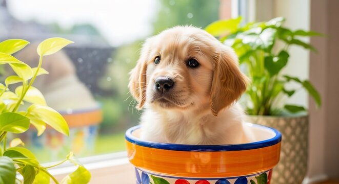 Adorable golden retriever puppy sitting in flower pot by window. Perfect for pet adoption campaigns, spring season, or heartwarming animal-themed projects.