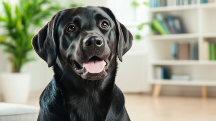 Black labrador retriever smiling in home interior with plants and bookshelf. Pet companionship concept perfect for animal adoption campaigns and home comfort marketing