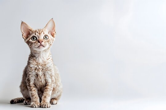 Adorable Devon Rex Cat with Unique Curly Fur and Expressive Eyes, Sitting Against a Soft, Light Background with Copy Space. advertising, flyer, grooming, pet shop banner, adoption Campaigns