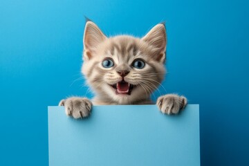 Adorable Kitten Holds Blank White Paper Sign, Perfect for Pet-Themed Advertisement or Message, Close-up View.