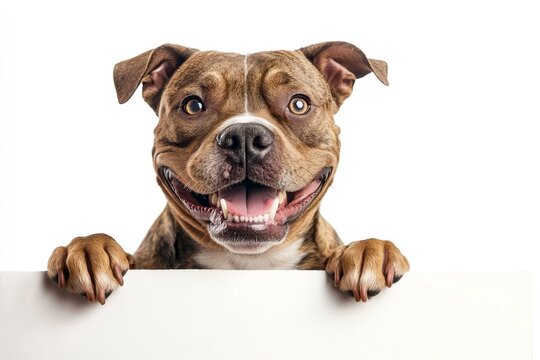 Dog promo image. Dog near mockup. Isolated dog on a solid clothing pure white background. Cute pet promo. Сute adult dog american bulldog hold in front paws a concept - large white drive sig.