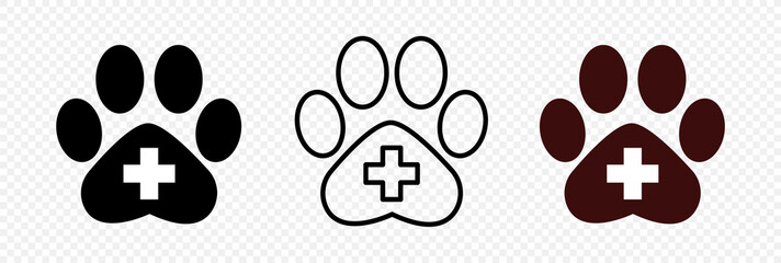 Pet first aid icons set. Dog or cat paw print. Medical cross symbol. Illustration