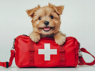 A dog first aid kit with a red cross on the front, with a golden retriever lying down next to it in a home setting.