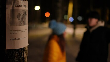 Close-up lost dog announcement on tree trunk in darkness with blurred young couple arguing at background. Stressed owners looking for pet in winter park at night outdoors