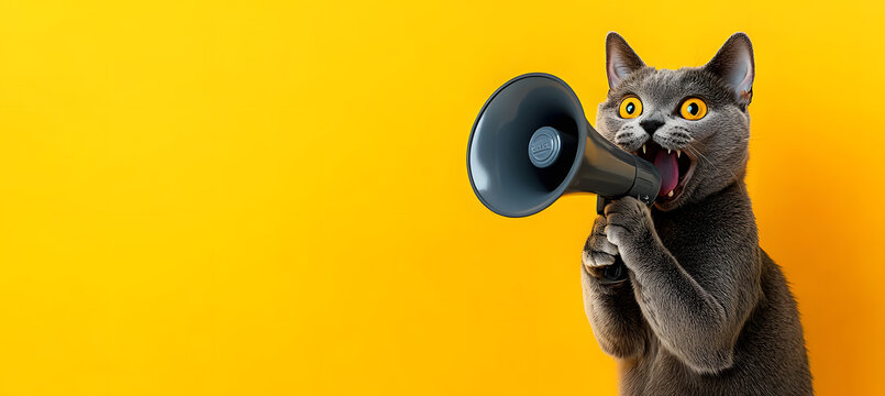 Grey cat with wide eyes holding a megaphone against a vibrant yellow background. Fun and energetic image suitable for announcements and promotions.
