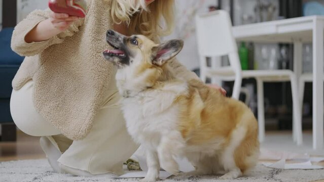 Cheerful asian woman training her dog, giving treats