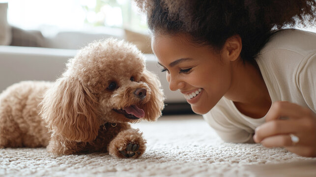 Happy Black woman playing with curly-haired poodle on carpeted floor, sharing joyful bonding moment in cozy and well-lit home interior.