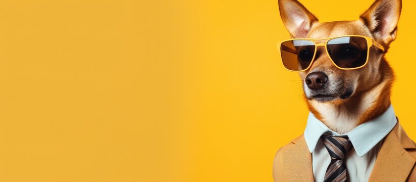 Animal dog portraits, Cool business animal in sunglasses and suit. With copy text space, wide screen. Simple background, Generative AI