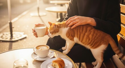 Young woman is drinking coffee and stroking pet cat in spring garden. Girl is sitting outdoors in cafe on blooming city streets with pink magnolia flowers.