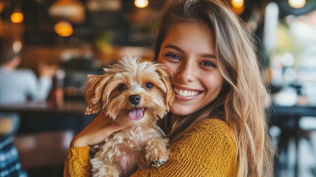 Portrait of cheerful caucasian female enjoying working with puppy in pet friendly cafe using laptop computer for freelancing, smiling woman 20s feeling happy sitting with cute dog on remote job