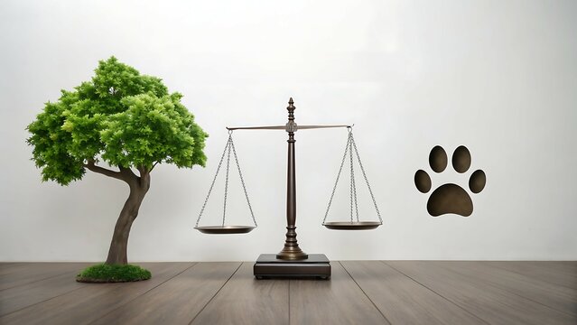 Animal Conservation Protection Policy Concept, A tree, scales of justice, and a paw print symbolize balance between nature and animals.
