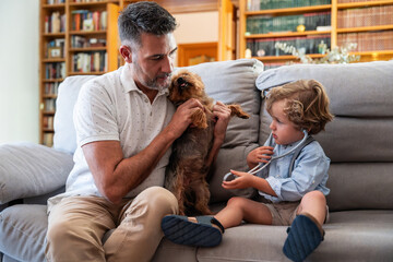 Cute senior elderly couple with loyal dog. Bond of lifelong love and companionship they share. Aged happy pet symbolizes the important aspects of life  loyalty, love, and togetherness.