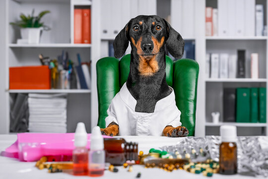 Dachshund dog doctor in white coat consulting table with bunch of scattered pills, tablets, medicines Nutritionist of Preventive Medicine, course on healthy dietary supplements, disease prevention