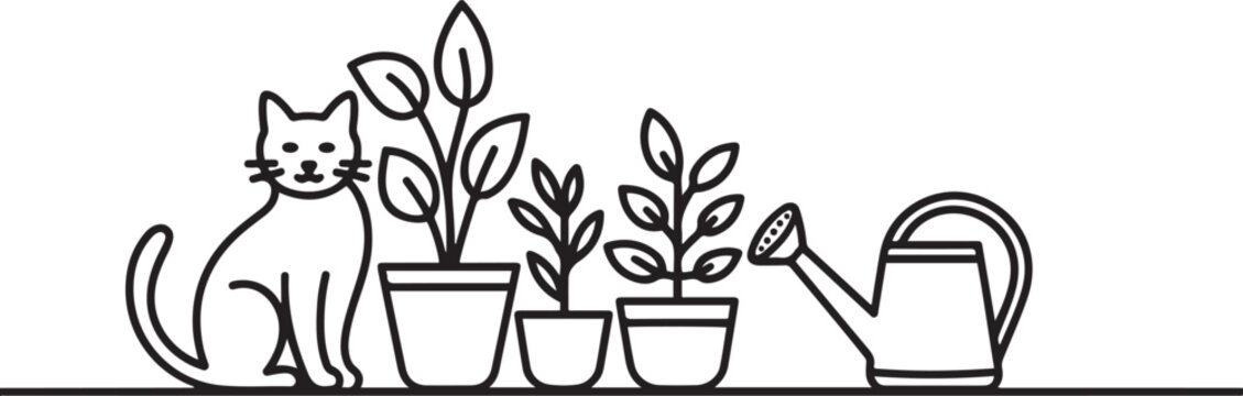 Black and White Sketch House Plants with a cat and a watering can on the window sill. one line Art icon drawing vector