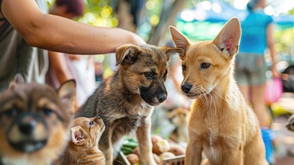Person interacting with a playful dog at a pet adoption event filled with colorful banners and enthusiastic pet lovers