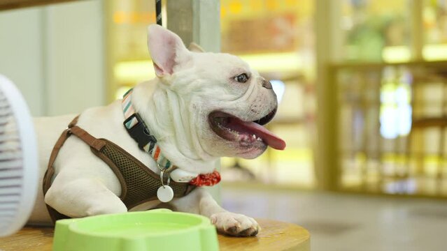 Asian man playing with his french bulldog in cafe at pets friendly shopping mall. Domestic dog and owner have fun outdoor lifestyle travel city on summer holiday vacation. Pet Humanization concept.