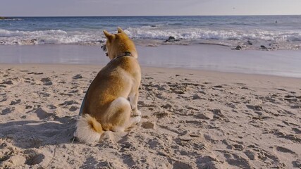 Cute cartoon dog wearing a striped shirt riding a teal kick scooter.
