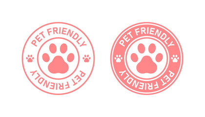 Pet friendly cafe, restaurant, hotel stamp logo. Animal pink paw symbol. Zoo, puppy, dog, cat, safe zone for pets. Colored style. Flat design. Vector illustration