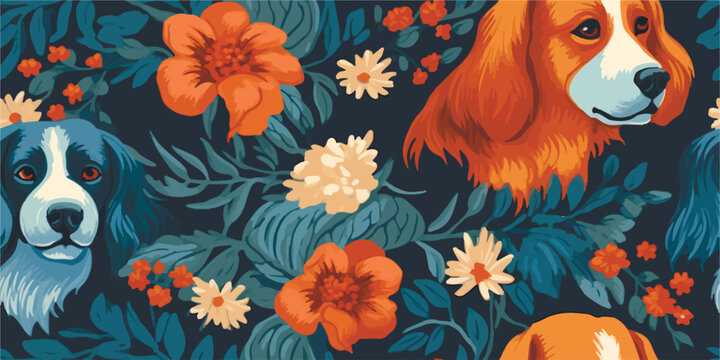 Seamless pattern with Cute cartoon dogs wearing different Christmas outfits.  Hand drawn vector illustration. Funny xmas background.