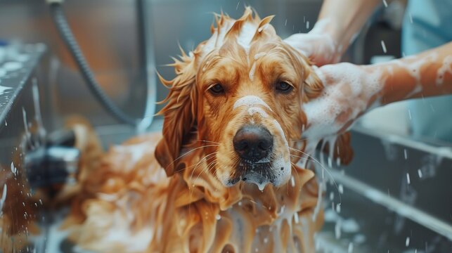 Professional pet groomer carefully washing a happy dog with soap and water in a well-equipped grooming salon, showcasing pet care and wellness services.