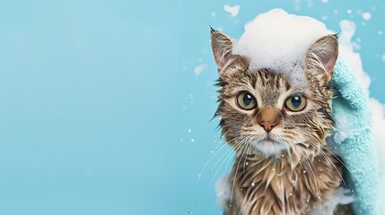 charming cat scrubs down with cleanser rises on blue background