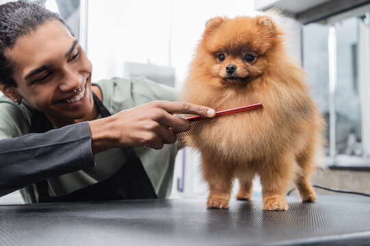 young african american man smiling while brushing spitz in grooming salon.