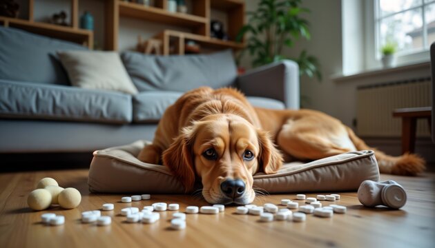 Tired dog lies on bed surrounded by scattered pills. Sad expression. Health problem medication concept. Indoor setting. Home scene. Pet health issue. Veterinary care. Medication for animals. Possible