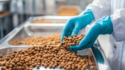 Pet Food Production Quality Control. Worker Inspecting Pet Food Pellets In Factory. Animal Care Industry Concept.