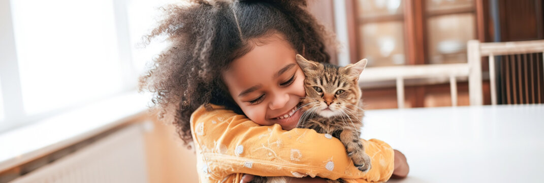 little girl with joyful expression hugging her tabby cat in bright, airy home, tender moment of child ans domestic pets friendship, lovely owner.
