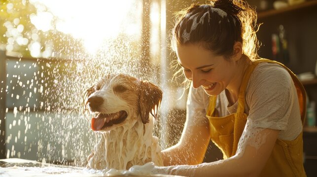 Woman joyfully bathes a wet dog under sunlight in cozy home setting, capturing the bond between human and pet in a moment of nurturing care.