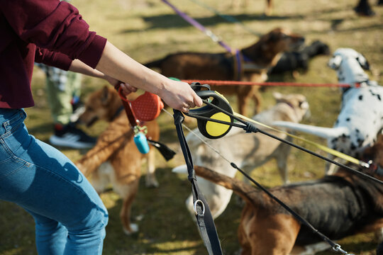 Dog walker leading mixed breed doggies group. Woman, pet sitter going with many puppies on leash. Different animals and girl from canine service. Flat vector illustration isolated on white background