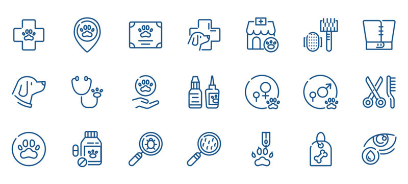 Pet Care and Veterinary Services Icons. Outline Vector Set for Vet Clinic, Animal Health, Dog Grooming and Emergency.