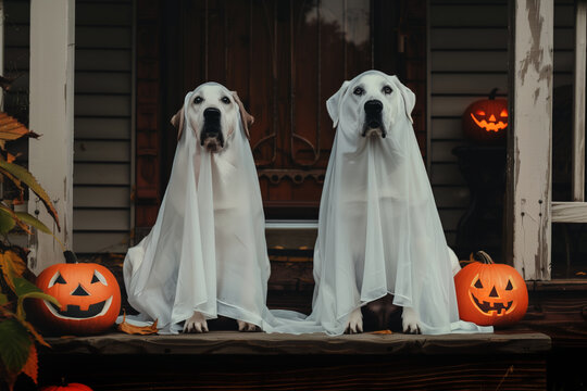 Dogs dressed as ghosts beside pumpkin lanterns. Generative AI image