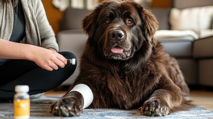 Veterinarian preparing injection for big brown dog Newfoundland with bandage