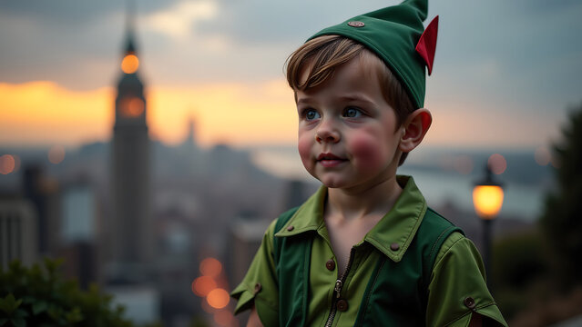 young boy tattered peter pan costume stands front blurred cityscape dusk golden streetlights casting long