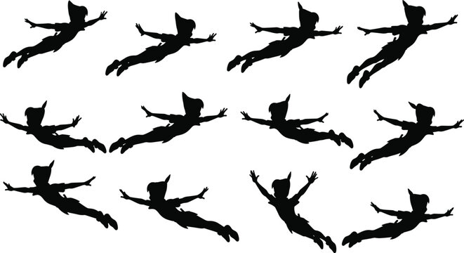 Flying silhouette vector illustration of fantasy character in motion, Peter Pan inspired figure artwork, magical fairy tale design concept