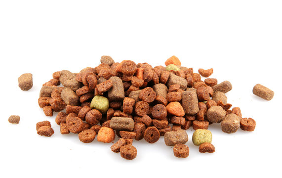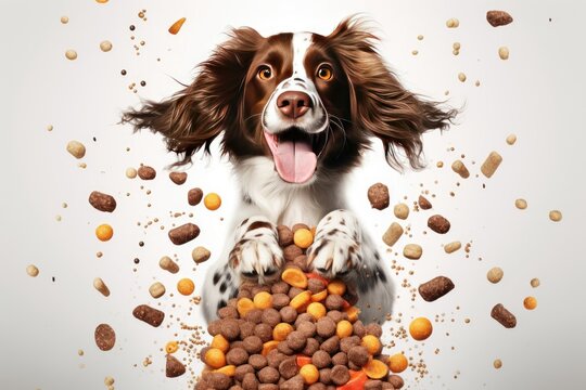 Colorful dry dog food in different shapes covering entire image providing balanced diet for canine companions
