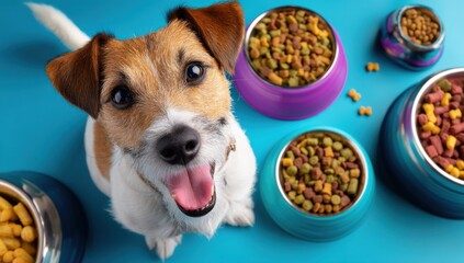 Happy Jack Russell Terrier dog looking up surrounded by bowls of various dog food kibble on a vibrant blue background. : Generative AI