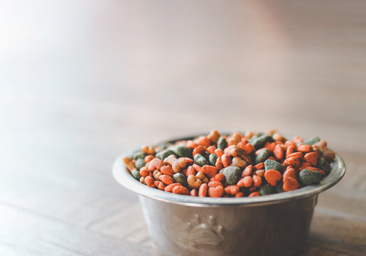 Multicolored dry dog food in a reflective metal bowl on a slate surface. Nutritious and diverse kibble mix for dogs. Hearty meal for pets with a variety of dry food shapes and colors.