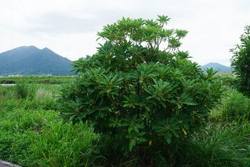 Title Evergreen Daphniphyllum macropodum tree with red petioles photography not AI generated