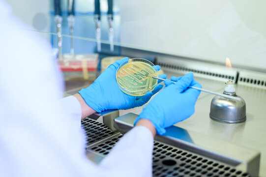 Scientist hand cultivating a petri dish whit inoculation loops in biological safety cabinet. Microbiologist works with bacteria.