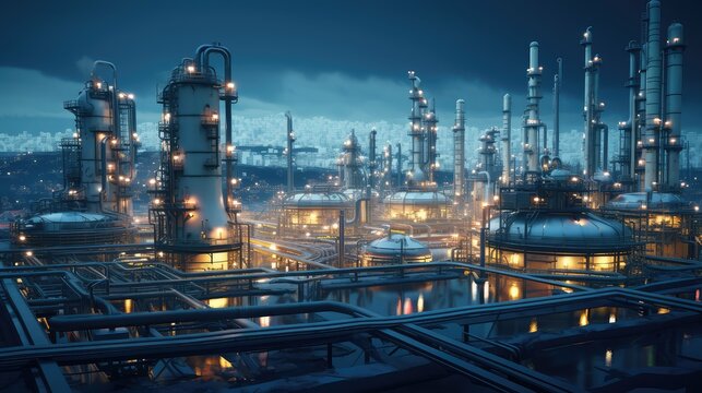 A panoramic view of an industrial petrochemical oil processing plant at dusk, with visible tanks and towers.