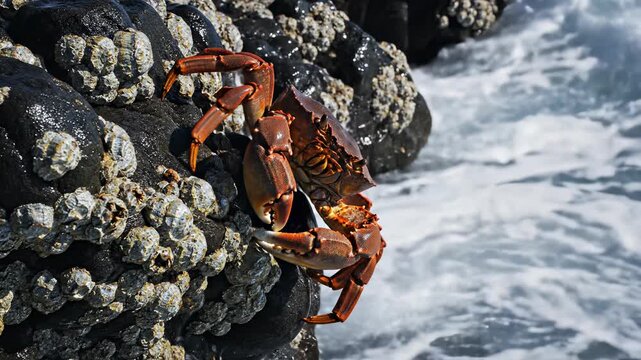 Crab on Barnacle-Covered Rocks Amidst Crashing Waves