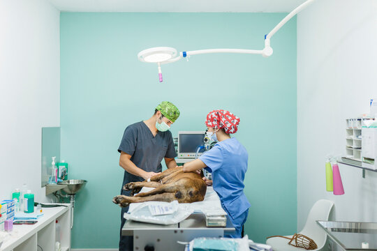 Veterinarian with healthcare worker examining dog on examination table at veterinary clinic