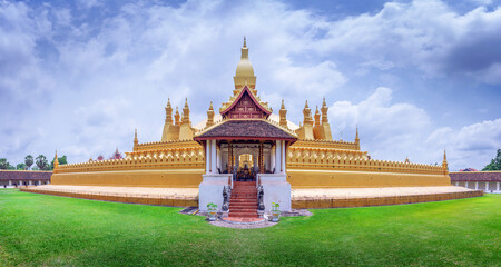 Vientiane Lao-July 6 2019 : Pha That Luang with blue sky background, Historical ancient golden pagoda religion place, View at front gate (editorial image)