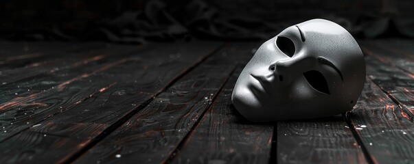White opera mask on a dark stage with black fabric. Dramatic and theatrical image.