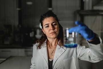 Competent female pharmaceutical researcher examining blue liquid in glass while creating new formula for drug in modern lab