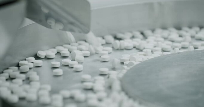White pills moving on metal automatic line in workshop of pharmaceutical factory. Factory equipment and machine conveyor. Industrial pharmaceutical concept. view of drugs move along conveyor belt.