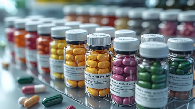 Colorful assortment of pharmaceuticals arranged neatly on a laboratory counter during a busy workday