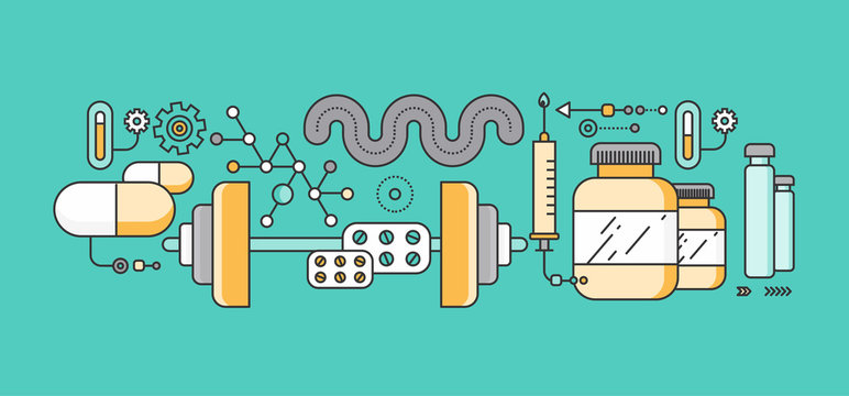 Medicine and pharmacology are represented by a variety of tablets, capsules, ampoules, vials, test tubes, syringes for injection and vaccines depicted on the side